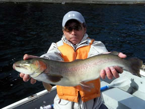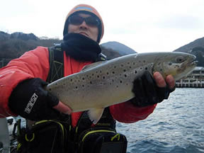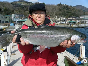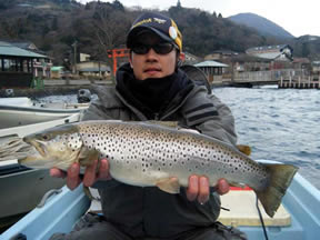 関谷 様 レインボートラウト61.5cm、3.5kg マラブーのフライキャスティング ポイントは元箱根湾 |