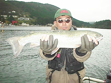 レインボートラウト:レギュラーサイズ0-3尾 午前中は結構釣れたそうです。お客さんは20ydがよかったそうです。今の時期だいたいどこの層にもいるので20-30yd。昨日の大風で岸に付いていた魚が離れて沖目の表層に結構いたようです。その為、