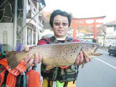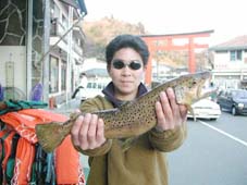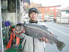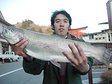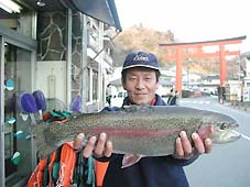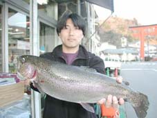 大阪市の小崎陽一氏。レインボートラウト49cm,1.9kg
