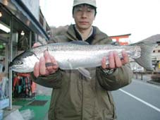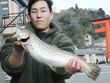 レインボートラウト53cm,1.4kg。ポイントは早川水門、マラブーのフライキャスティングで釣りました。