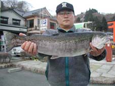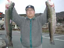 江戸川区の後藤純氏。 レインボートラウト、51.5cm、1.8kg アオミドロのフライキャスティングでつりました。 ポイントは,早川口です。