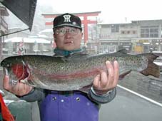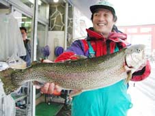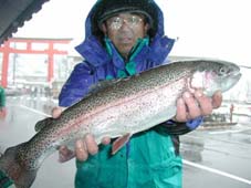本日の大物は平塚市の龍野智久氏。レインボートラウト61cm,2.6kg