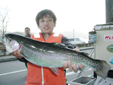 | 釣果 レインボートラウト30cm〜54.5cm 0〜3尾 ブラウントラウト30cm〜41.5cm 0〜1尾 今日の大物は群馬県の小泉清氏。 レインボートラウト54.5cm、2kg ポイントは元箱根湾です。 K−1ミノーのルアーキャスティングです。 ブラウントラウト大物は伊豆長岡町の浜村誠氏。 ブラウントラウト41.5cm、0.9kg ポイントは、平岩です。 ゾンカーのフライキャスティングです。 ルアー、フライ、タナ等詳細は当店までお問い合わせください。 |