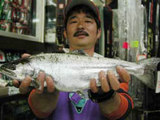 釣果 レインボートラウト30-56cm 0-2尾 アマゴ42cm 1尾 本日の大物はレインボートラウト56cm,2.3kg 釣り人は横浜市の川崎富二夫氏。 ポイントはクラ石です。 キクチミノーエペルランのトローリングで釣りました。 写真上は伊東市の春田 善仁氏。アマゴ42cmトローリング70ヤード、ポイントは鳥居前。 ルアーはアワビです。