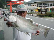 アマゴは当店主野崎茂則 47cm,1.3kg 庭石にてトローリング