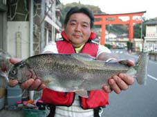 トローリングはアワビ使用、60ydポイントはカエル石です。 レインボートラウト47cm,1.6kg