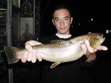 ブラウントラウトは愛媛県の富成勝彦氏。 45cm、1.0kg ポイントは山の神です ORA-LTZ80アワビのトローリング90ydで釣りました。