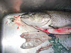 斉藤慶次さんブラウントラウト83.5cm,6.7kgの胃の中からニジマスと思われる魚が3匹出てきました。