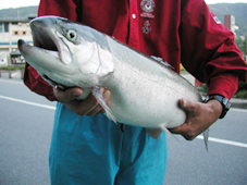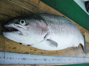 釣果 レインボートラウト 30cm〜68.5cm,0〜3尾 大物は横浜市の川崎富二夫さん,レインボートラウト68.5cm 4.36kg ポイントはコベリです。 山本アワビ7cmのトローリング50yで釣りました。