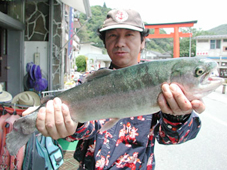 本日の大物は横浜市の川崎富二夫さん,レインボートラウト49cm,1.6kg