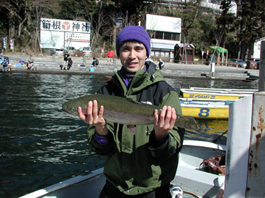 寒川町の三留 義正さん。 レインボートラウト63cm,3.45kg。 カレン4.5gのルアーキャスティング。 ポイントは元箱根湾。