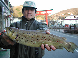 平塚市の龍野智久さん。 ブラウン トラウト41cm,1.0kg。 キクチミノー13金箔のルアーキャスティング。 ポイントはトリカブト。