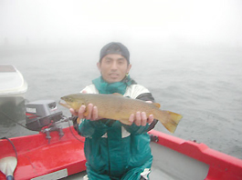ブラウントラウト43cm,1.1kg。 釣り人は藤沢市の佐藤隆之氏。 ムラセミノー13cmのルアーキャスティング。 ポイントはマリーナ。