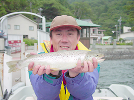 ブラウントラウト45cm, 1.1kg 伊豆長岡町の浜村誠さん。 白蝶貝のトローリング60y。 ポイントは湖尻。