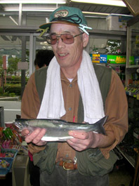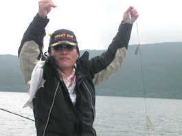東京都大田区の平林康さん。 ヒメマス4尾。 ロスコ、ツノ使用。タナは20m。 ポイントは庭石沖。