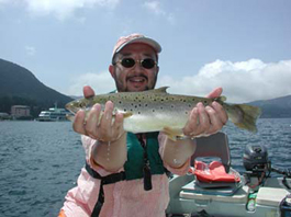 埼玉市の贄田文男さん。 3人でヒメマス21尾。 タナは18〜19m。 ポイントは百貫ノ鼻〜龍宮殿〜箱根園等。