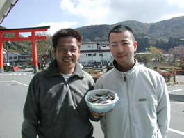 神奈川県秦野市の大島盛夫さん。 ワカサギは2人で約800g。 アカムシとカラバリ使用。