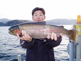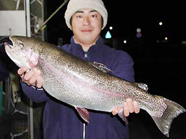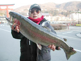 神奈川県横浜市 宮坂浩司さん レインボートラウト67cm/4.8kg シェルズギャレット13cmのルアーキャスティング。ポイントは文ザエモン。