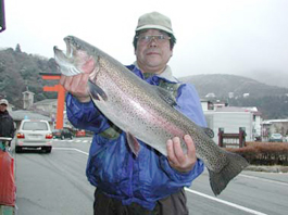 神奈川県横浜市 斉藤慶次さん。 レインボートラウト60cm,2.8kg ゾンカーのフライキャスティング。 ポイントはヒルガ。