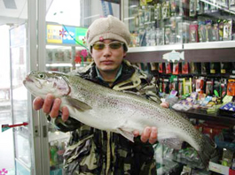 長野県松本市 嶋田浩明さん。 レインボートラウト59.5cm,2.5kg トゥインクルのルアーキャスティング。 ポイントは白鳥の湾。