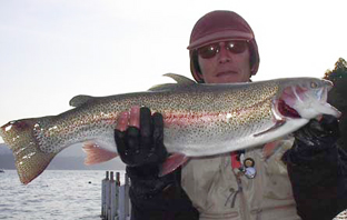 東京都大田区 松原哲治さん。 レインボートラウト61cm,2.2kg マラブーのハーリング。 ポイントはプリンスホテル前。