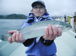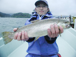 東京都渋谷区の山田耕二さん レインボートラウト41cm,0.9kg T-シェル夜光貝のトローリング30Y ポイントは湖の中央