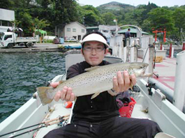 東京都渋谷区山田耕二さん ブラウントラウト48cm,1.5kg T-シェル白蝶貝のトローリング60ヤード ポイントはプリンスホテル。