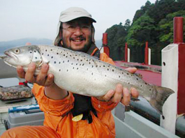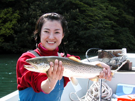 東京都渋谷区田窪典子さん ブラウントラウト48cm,1.2kg TホーンAW のトローリング。 ポイントは箒の鼻。