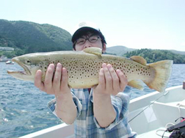 東京都大田区 平林康さん。 ブラウントラウト49.5cm, 1.5kg ラパラのトローリング ポイントは 青い屋根
