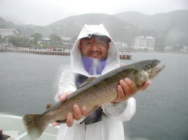 東京都渋谷区辰宮太一さん レインボートラウト58cm,2.2kg T-ホーンのトローリング80ヤード ポイントは百貫沖