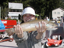 東京都渋谷区田窪典子さん ブラウントラウト49cm,1.5kg T-ミノー70LG-Sのトローリング85ヤード ポイントは立石
