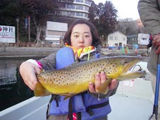 東京都文京区の石川 ますみ様 ブラウントラウト44.5cm,1.3kg ビクセン90Fのルアーキャスティング ポイントは庭石