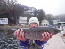 鈴木 様 レインボートラウト55cm,2.2kg、 マラブーのフライキャスティング ポイントは白鳥のワンド