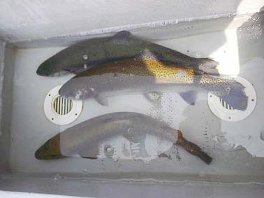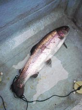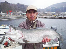神奈川県足柄上郡の相原 光明様 レインボートラウト53.5cm,2.22 ウーリーマラブーオリーブのフライキャスティング ポイントは元箱根湾