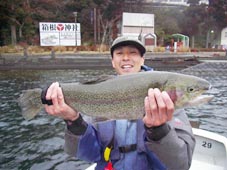 神奈川県茅ヶ崎市の鈴木 敬一 様 レインボートラウト62.5cm,3.2kg、 MSライトオリーブのフライキャスティング ポイントはノザキ前