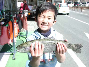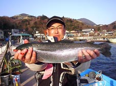 東京都江戸川区の後藤 純様 レインボートラウト63cm,2.96kg、 ゾンカーグリーンのフライキャスティング ポイントは成渓