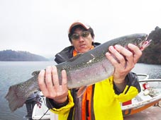 渋谷 賢史様 レインボートラウト55cm、2.08kg、 ギャレット13cm金箔のルアーキャスティング ポイントは山のホテル