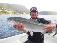 千葉県松戸市の齊藤 克也様 レインボートラウト 57.5cm、2.32kg、 ウナジロウ鮑キールのトローリング65ヤード ポイントは山のホテル前