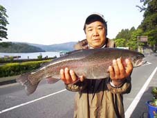 神奈川県足柄上郡の相原 光明様 レインボートラウト 57cm、2.5kg、 ウーリーマラブー黒のハーリング ポイントは元箱根湾