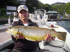 神奈川県横浜市の菊地 達也様 ブラウントラウト 52cm、2.26kg トローリングペッパー75のトローリング80 ポイントは神社下