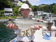 東京都新宿区の小暮 良也様レインボートラウト 46cm、1.24kg、 7cmミノーアルミのトローリング90ヤード ポイントは青屋根の別荘沖
