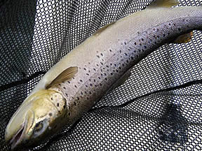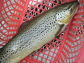 齋藤藤 様 ブラウントラウト44.5cm、1.06kg オリジナル角のトローリング ポイントは湖尻 |