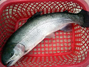| 野々村 様 レインボートラウト63.5cm、3.12kg ゾンカーオリーブのフライハーリング ポイントは早川水門 |