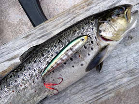 | 大石 様 ブラウントラウト42.0cm、0.92kg ナカジマミノーのトローリング ポイントは蛙石 |