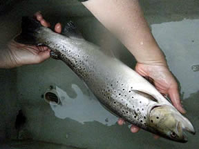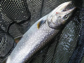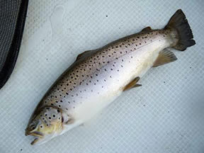 飯田 様 ブラウントラウト48.5cm、1.4kg カズミノーT95FS夜光貝のトローリング ポイントは立石 |