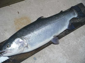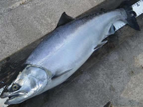 管野 様 サクラマス(全長46p、又長45p)、1.2kg カズミノーFS95鮑のトローリング50ヤード ポイントは立石湾 |