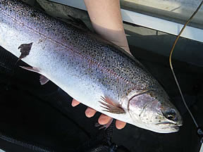 | 飯田 様 レインボートラウト58cm、2.38kg カズミノーT9FS銀箔南洋貝のトローリング30ヤード ポイントは大島 |