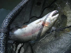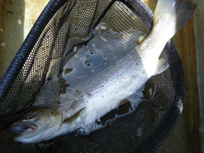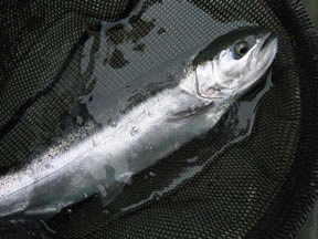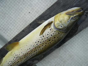 飯田 様 ブラウントラウト43.5cm、1kg カズミノーT75FS黒龍のトローリング ポイントは庭石 |