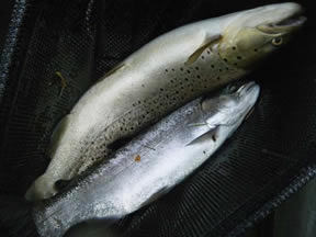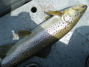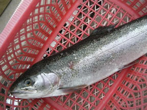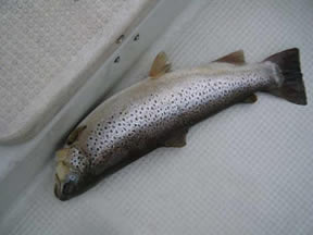 飯島 様 レインボートラウト58.5cm、2.28kg 自作アワビのトローリング80ヤード ポイントは禁漁区ブイ沿い |