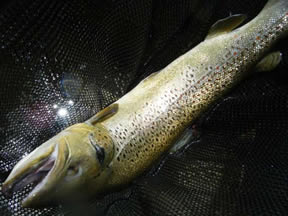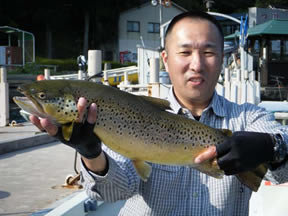 | 佐藤 様 ブラウントラウト48.5cm、1.26kg ウッドベイト8FTのトローリング ポイントは庭石 |